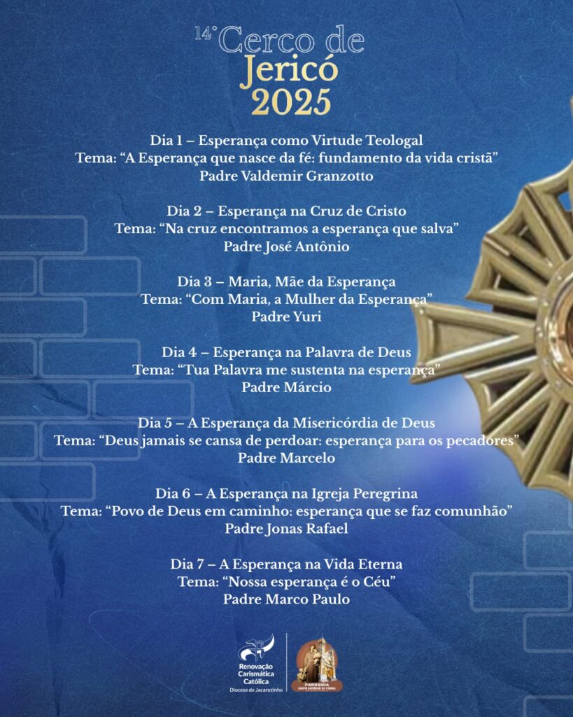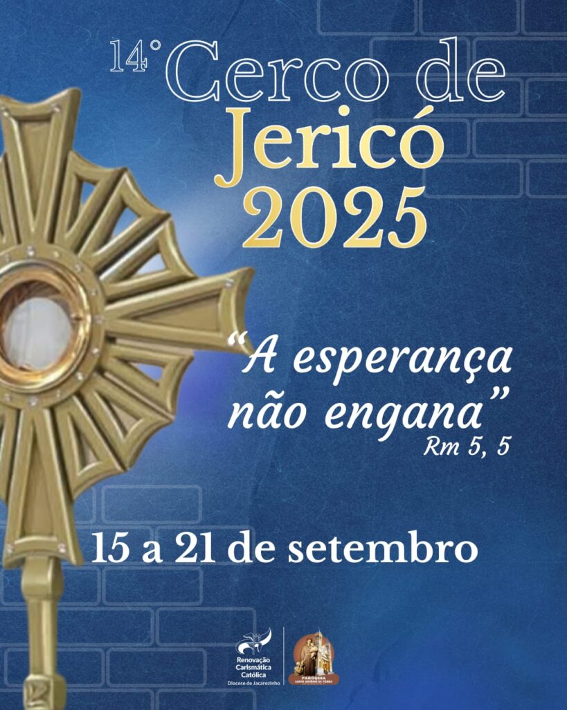 De 15 a 21 de setembro, a Paróquia Santo Antônio de Pádua realiza o 14º Cerco de Jericó, um dos momentos mais esperados pela comunidade católica local. Neste ano, o encontro traz como tema “A esperança não engana” (Rm 5,5), inspirando os fiéis a fortalecerem sua fé e confiança em Deus.