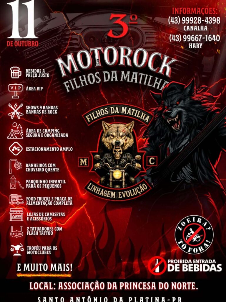 O 3º Motorock Filhos da Matilha promete ser um dos maiores eventos do ano na região, unindo cultura, lazer e solidariedade em Santo Antônio da Platina.