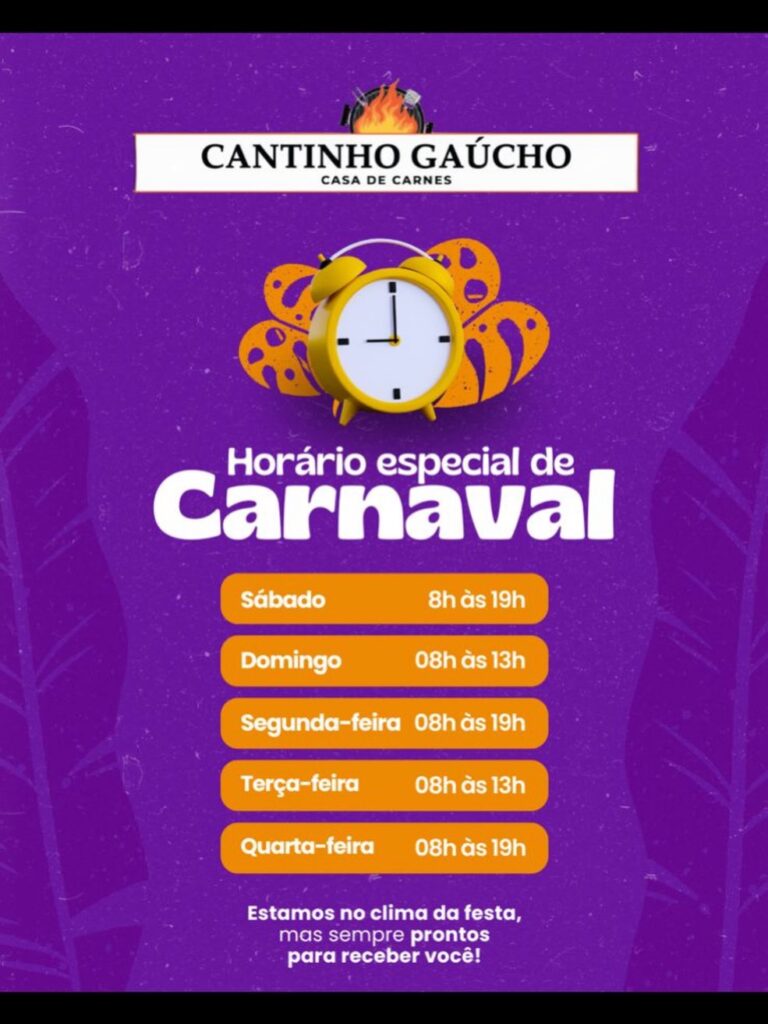 Em clima de festa, mas sem deixar a qualidade de lado, a Casa de Carnes Cantinho Gaúcho, em Santo Antônio da Platina, está com horário especial de atendimento nesta segunda e terça-feira de Carnaval.