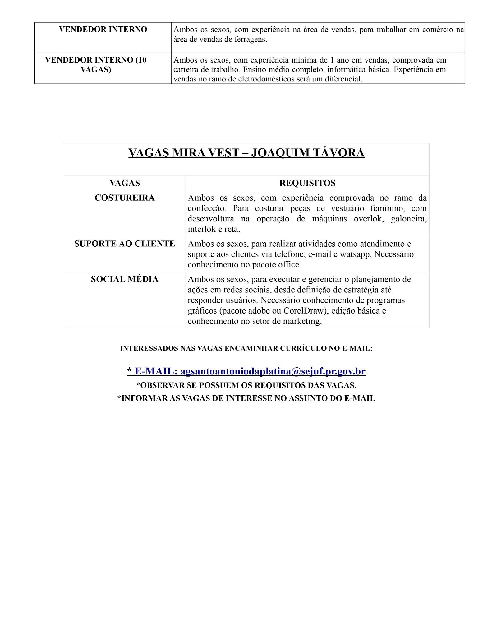 Confira as vagas de emprego disponíveis para Santo Antônio da Platina neste dia 13.