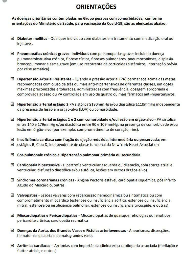 A Secretaria Municipal de Saúde iniciou nesta sexta feira, dia 07, a vacinação contra a Covid 19 para a população com comorbidades em Santo Antônio da Platina, confira abaixo a lista de doenças prioritárias para esta fase.