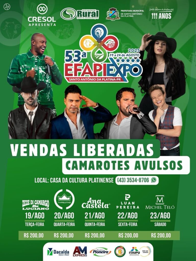 LIBERADA A VENDA DE CAMAROTES AVULSOS DA 53ª EFAPI EXPO DE SANTO ANTÔNIO DA PLATINA