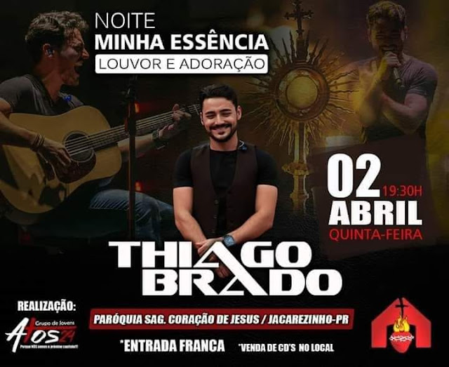 A Paróquia Sagrado Coração de Jesus e o Grupo Atos 29 trás a Noite Minha Essência com a presença de Thiago Brado no dia 02 de Abril às 19h30m, para uma noite de muito louvor, adoração, oração e musica.