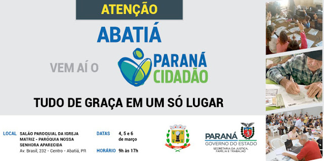 O Paraná Cidadão, programa do governo do Estado, por meio da Secretaria da Justiça, Família e Trabalho e com a ajuda da prefeitura e instituições parceiras, oferecerão serviços gratuitos durante os dias 4, 5 e 6 de março, em Abatiá.