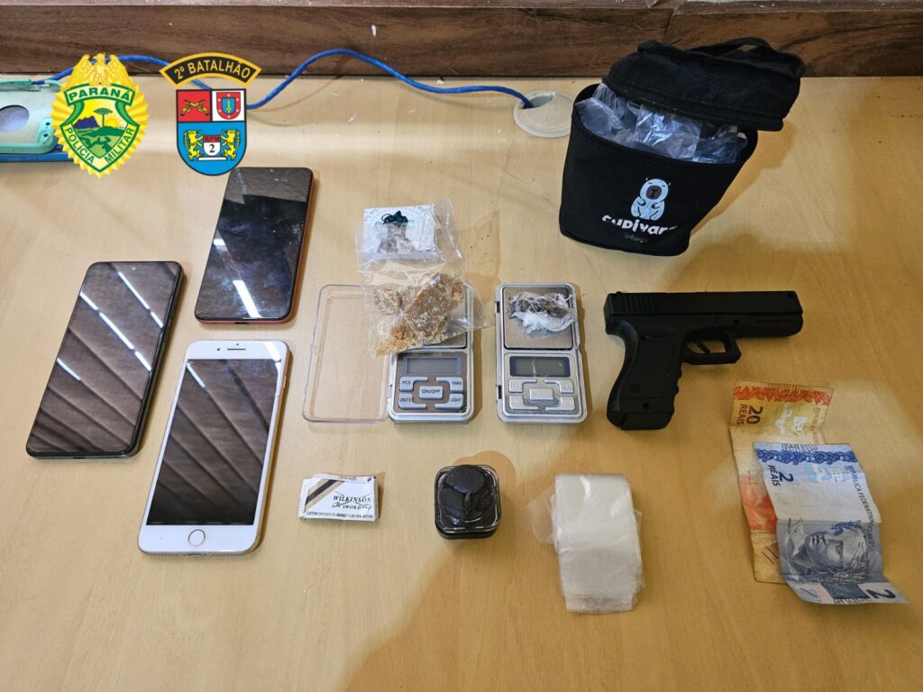 Durante a revista pessoal, foi localizado com um dos abordados um simulacro de arma de fogo preso à cintura. Com outro suspeito, os policiais encontraram uma sacola contendo porções de substâncias análogas ao crack e à maconha, além de uma balança de precisão, lâminas e diversos invólucros plásticos comumente utilizados para o fracionamento e comercialização de drogas.