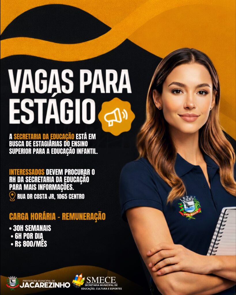 Os interessados devem procurar o RH da Secretaria de Educação para obter mais informações e participar do processo. O estágio conta com carga horária de 30 horas semanais (6 horas por dia) e bolsa no valor de R$ 800,00.