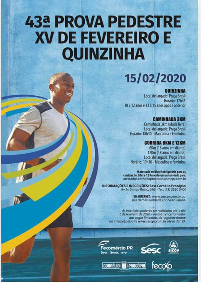 A cidade de Cornélio Procópio está completando 82 anos neste final de semana, e com ela o Sesc, Fecomércio PR, Sicov, Prefeitura Municipal e Fecop, estão realizando a 43 edição da Prova Pedestre XV de Fevereiro e Quinzinha.